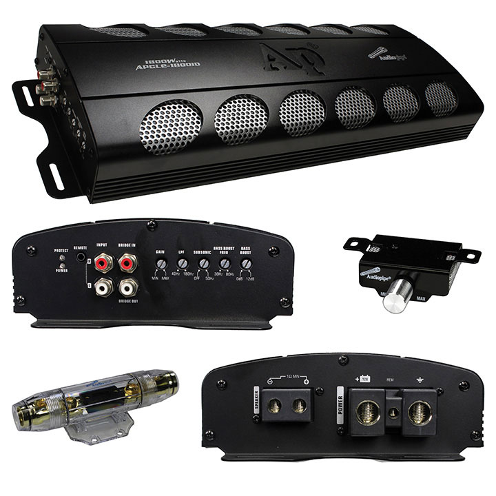 Audiopipe 1800W Class D amplifier overload/overheat protection remote woofer volume control APCLE18001D