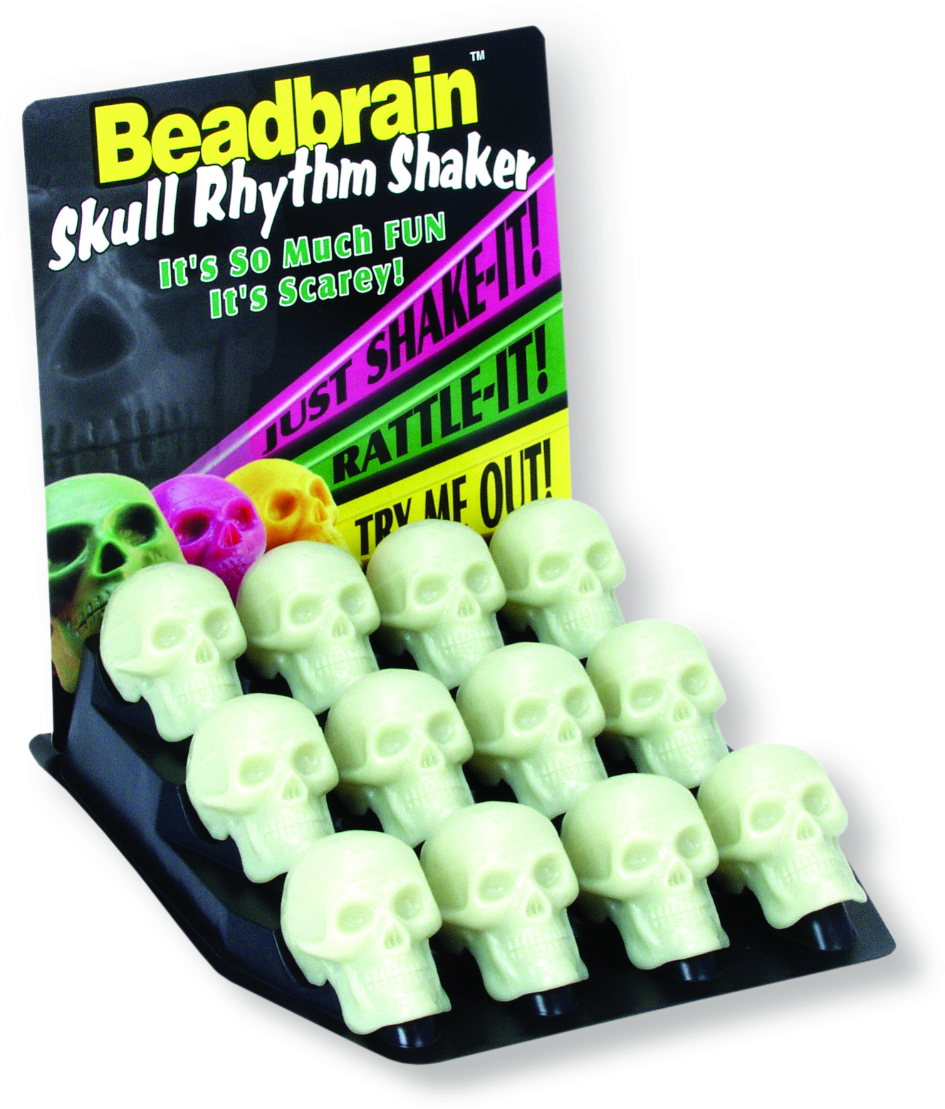 Beadbrain™ skull shaker glow in-the dark display. (12 Pcs.)