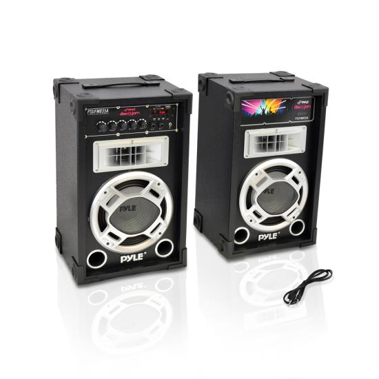 Dual 800 Watt Disco Jam Powered Two-Way PA Speaker System w/ USB/SD Card Readers, FM Radio, 3.5 mm AUX Input (PSUFM835A)