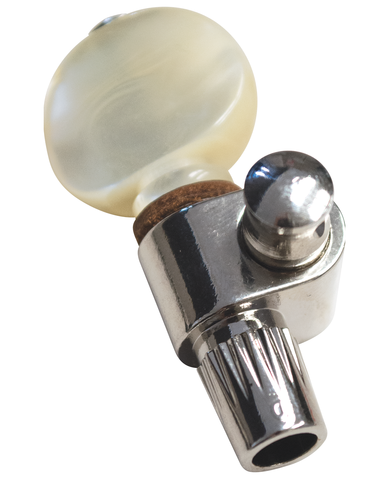 The traditional design of the nickel-plated gear case with “Dual Bands” is machined from solid brass; housing the smooth action, right angled, worm gear assembly. Each tuner is factory sealed and lubricated to assure a lifetime of reliable smooth function. The beautiful pearloid button with leather spacer is not only comfortable to hold, but is tension adjustable for exceptional note stability.