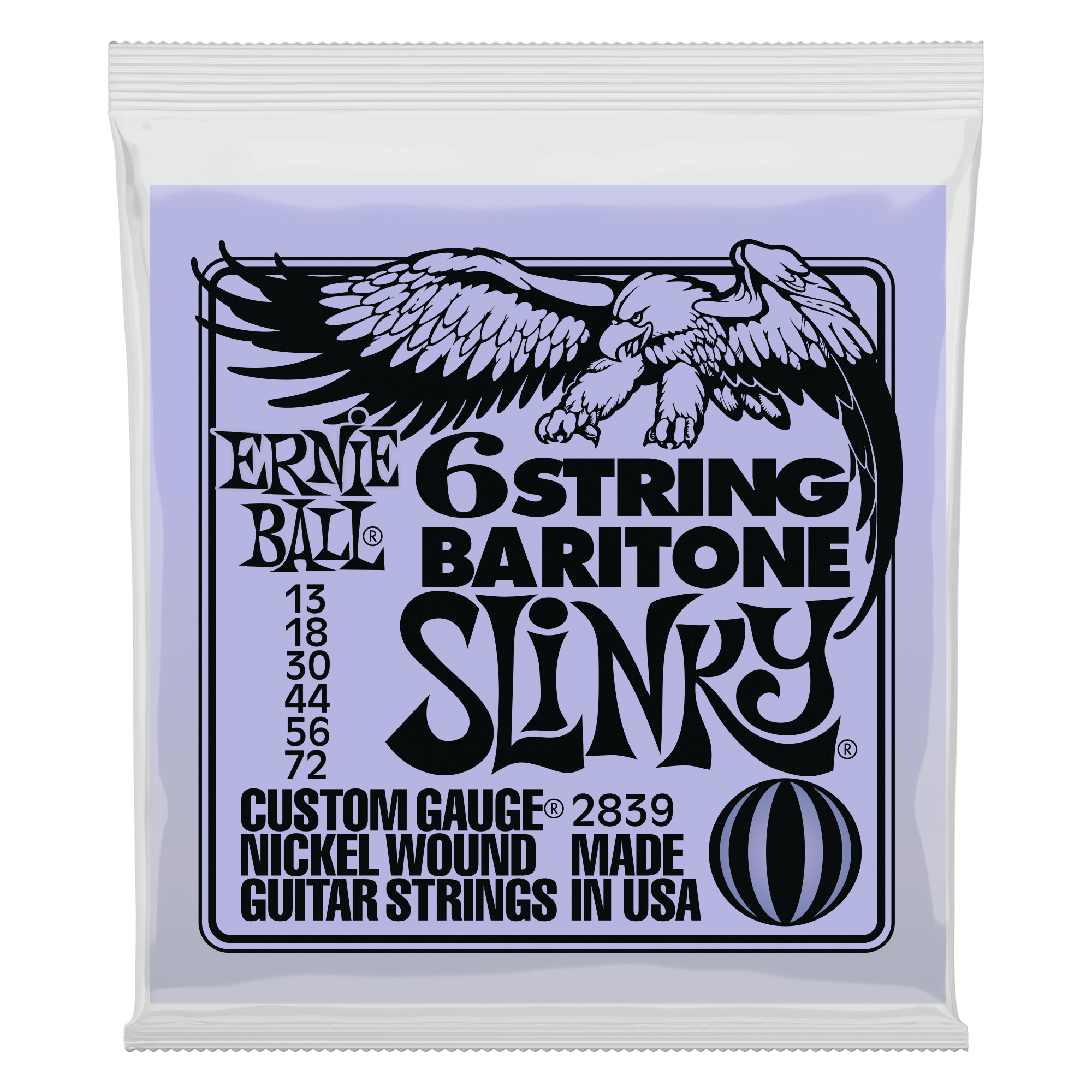 Ernie Ball Nickel Wound 6-string Baritone Electric Bass Strings are made from nickel plated steel wrapped around a hex shaped steel core wire. The plain strings are made of specially tempered tin plated high carbon steel. Each bass guitar string produces a bright, balanced tone and manufactured with small ball ends like guitar strings, not large ball ends used on traditional electric bass strings. These sets are optimal for A-A or B-B tuning combinations and are a perfect match for baritone instruments. Gauges .013, .018p, .030, .044, .056, .072